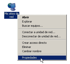- Haga un clic con el botón derecho del mouse a Mis sitios de red (ubicado normalmente en el escritorio) y escoja la opción Propiedades: