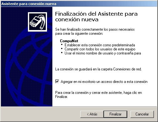 - Se ha completado el proceso de crear una conexión a CompuNet, si desea, marque la casilla: Agregar en mi escritorio un acceso directo a esta conexión. Haga click en el botón Finalizar.