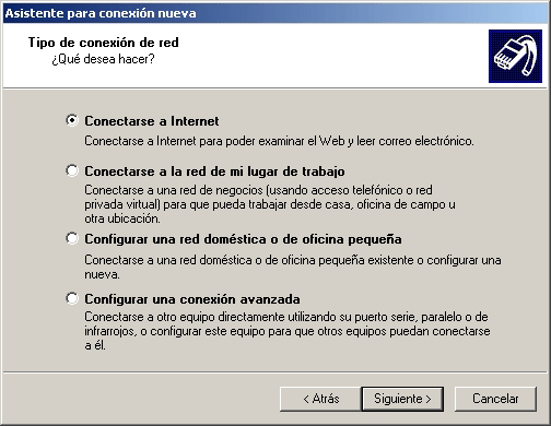 - En la siguiente pantalla seleccione la segunda opción denominada Conectarse a Internet, luego presione el botón Siguiente.