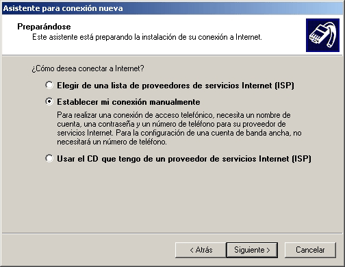 - En la siguiente pantalla del asistente seleccione la segunda opción denominada Establecer mi conexión manualmente, luego presione el botón Siguiente.