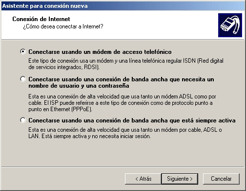 - En la pantalla que se despliega debe estar seleccionada la opción: Conectarse usando un modem de acceso telefónico, luego presione el botón Siguiente.