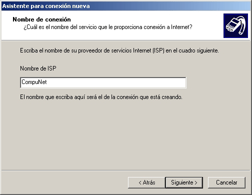 - Ingrese como Nombre de ISP: CompuNet, luego presione el botón Siguiente.