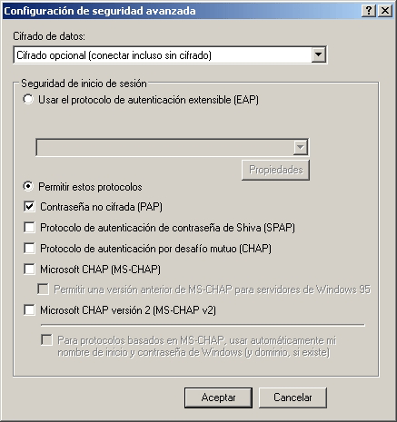 - En la parte superior de esta ventana, en Cifrado de Datos, seleccione la opción: Cifrado opcional (conectar incluso sin cifrado). En la misma ventana en la sección: Permitir estos protocolos:, seleccione (con una marca) únicamente la opción: Contraseña no cifrada(PAP), dejando el resto de las opciones sin seleccionar. En seguida haga clic en Aceptar.