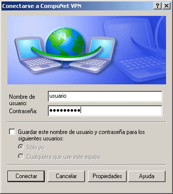 - Para establecer la conexión, haga doble clic en el ícono CompuNet VPN (que acaba de configurar) e ingrese los datos de su cuenta y presione el botón Conectar.
