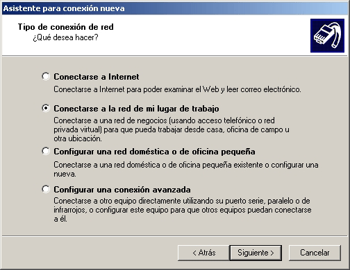 - En la siguiente pantalla seleccione la segunda opción denominada Conectarse a la red de mi lugar de trabajo, luego presione el botón Siguiente.