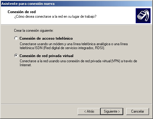 - En la siguiente pantalla del asistente seleccione la segunda opción denominada Conexión de red privada virtual, luego presione el botón Siguiente.