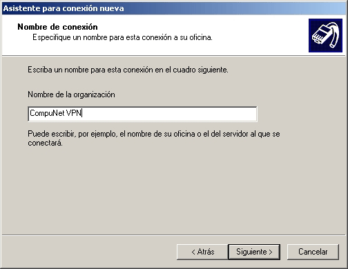 - En la pantalla que se despliega debe ingresar un nombre para identificar la conexión. Escriba: CompuNet VPN, luego presione el botón Siguiente.