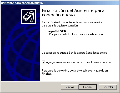 - La siguiente es la última de las pantallas del asistente, debe presionar el botón Finalizar, con lo que finalizará la primera parte de la creación de la conexión. Si desea puede marcar la casilla: Agregar en mi escritorio un acceso directo a esta conexión.